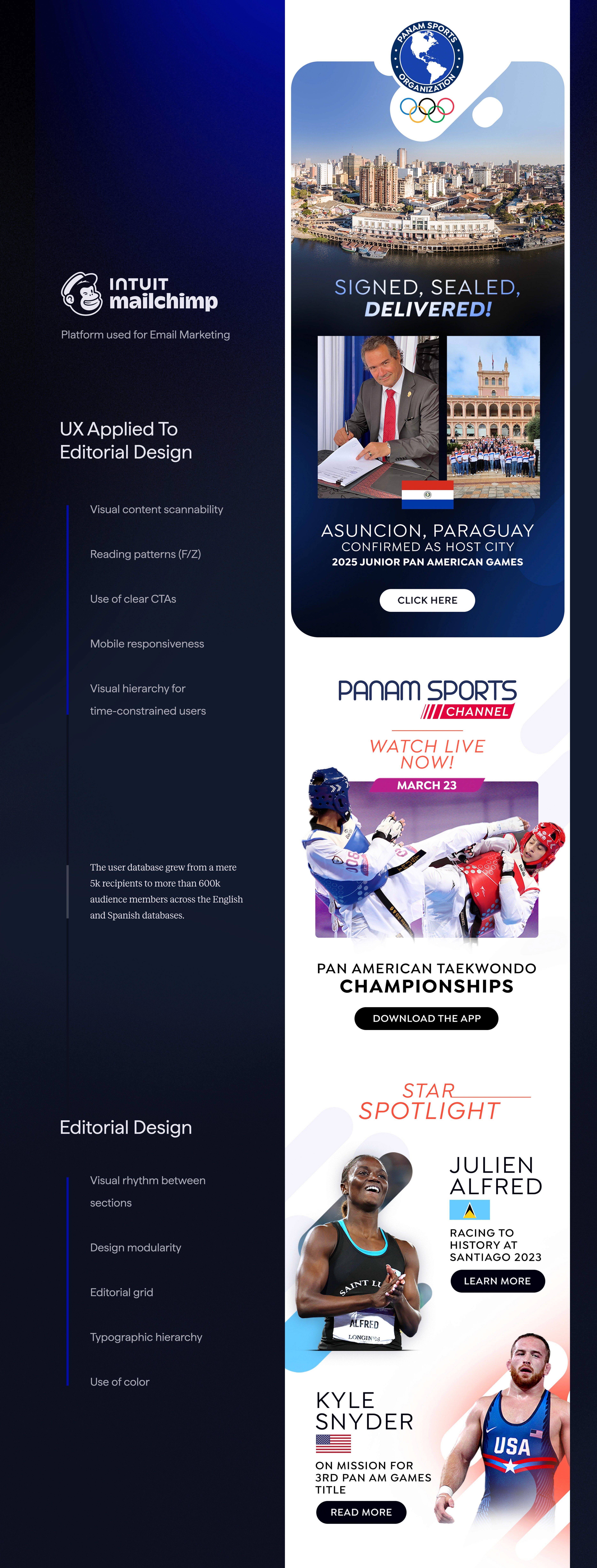 I redesigned the newsletters with a mobile-first approach, prioritizing legible typography, clear information hierarchy, and visual breathing room to improve readability on smaller screens. Each layout was built around strong visual storytelling, guiding readers through the content as an editorial sports experience rather than a static email. I introduced a flexible layout system that could evolve over time, allowing new content categories to be added while remaining compliant with Panam Sports and IOC brand guidelines. The newsletters served both as an information channel for sports media and as a marketing tool for upcoming events, integrating clear calls to action, buttons, and links using UI and UX best practices. With creative freedom from leadership, I gradually elevated the visual language by featuring striking athlete and event photography in the header each month. These visuals celebrated the achievements of the athletes of the Americas while creating a strong emotional hook that encouraged readers to engage with the content.